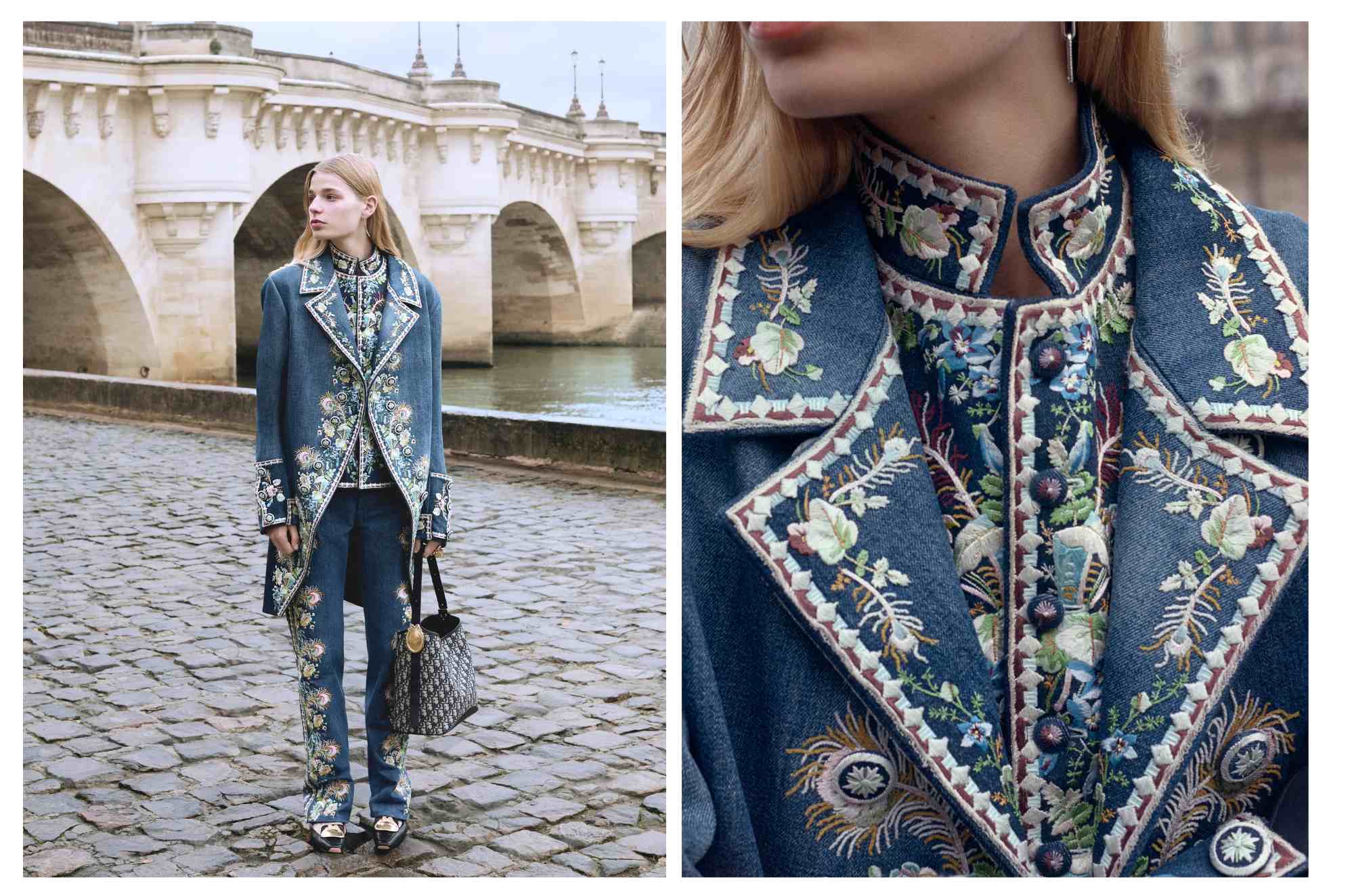 La collection laisse également apparaître l’idée d’un vestiaire partagé, perceptible notamment dans le retour d’un tailcoat en denim brodé d’inspiration XVIIIᵉ siècle, déjà aperçu dans la collection masculine précédente.