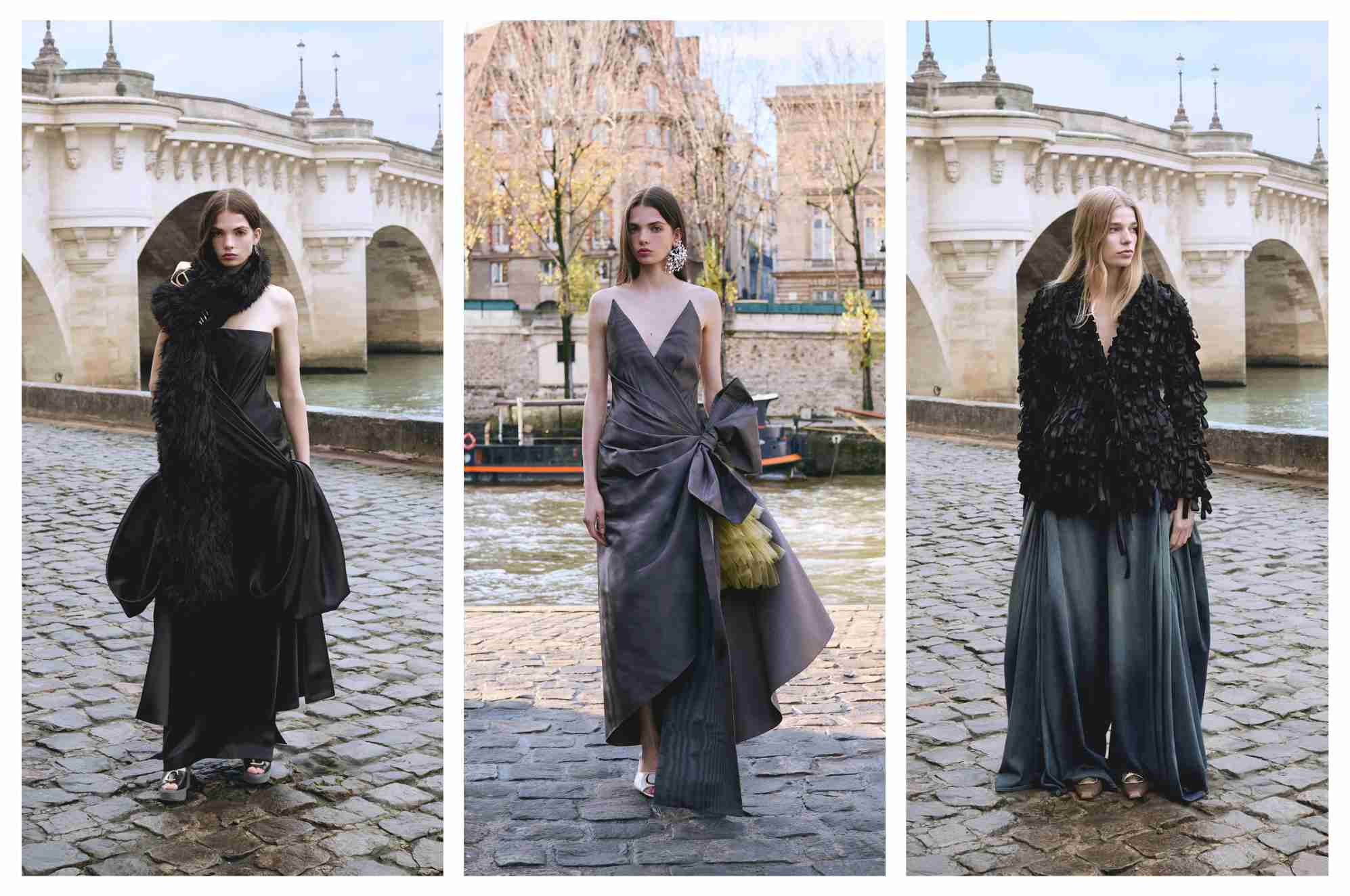 Les robes reposent sur un travail de drapés latéraux, de volumes noués et d’asymétries maîtrisées. Certaines silhouettes jouent sur une tension entre maintien et souplesse, notamment grâce à des superpositions de tulle rigide sous des étoffes plus lisses, ou à des nouages latéraux qui redessinent la ligne du corps.